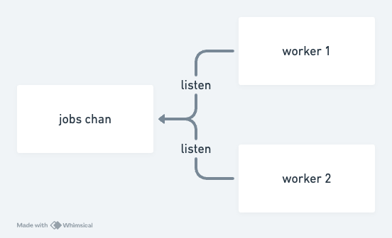 2In this example, we have two workers that always listening to the jobs channel. For every new value added to the channel, the worker will process it.